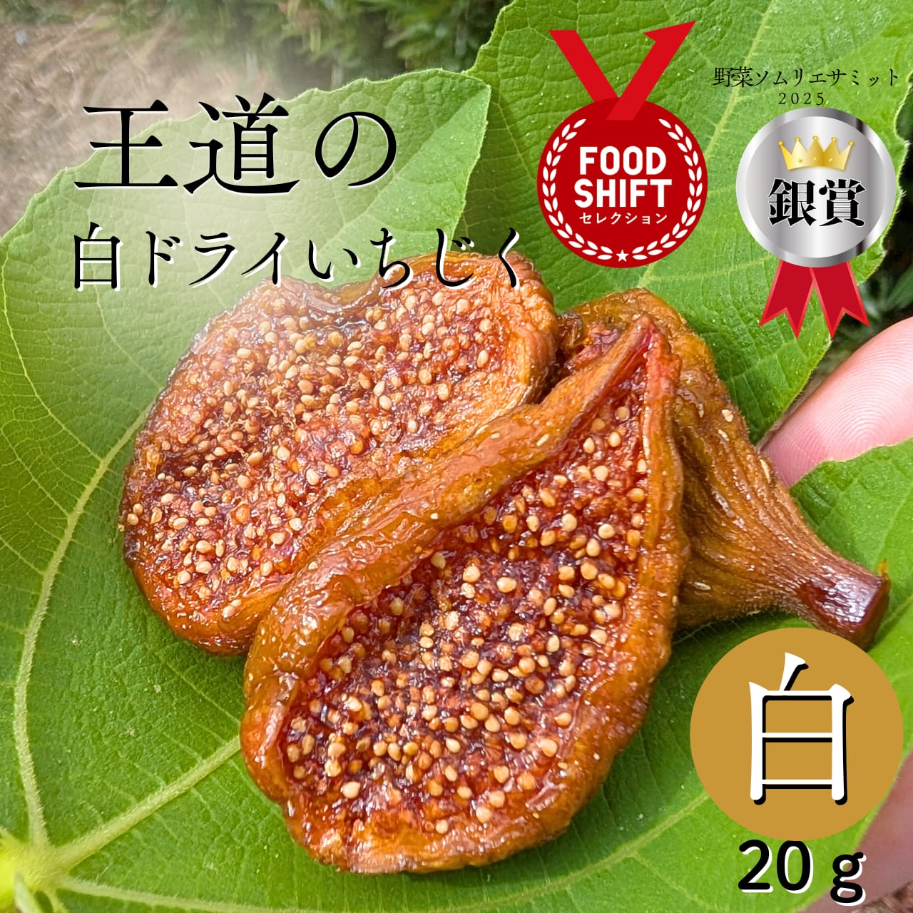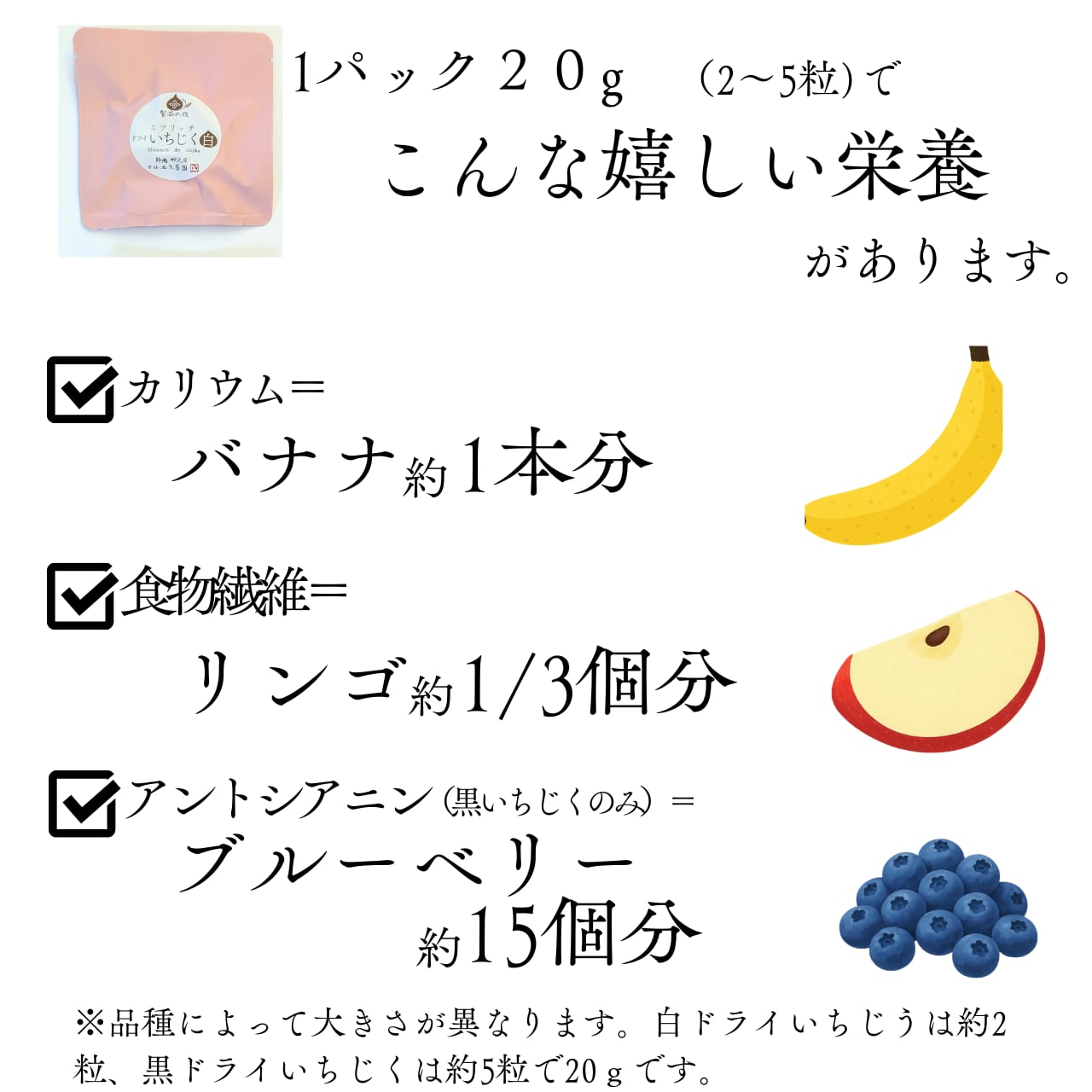 白ドライいちじくの場合、わずか2粒(約20g)でバナナ1本分のカリウムとりんご1/3個分の食物繊維です