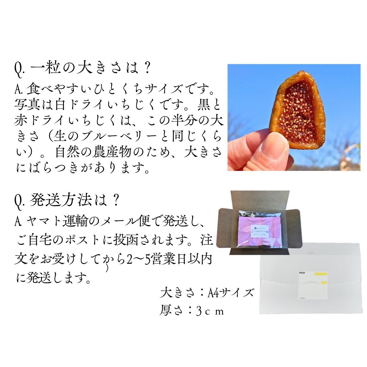 ※黒と赤ドライいちじくは、白ドライいちじくに比べて小粒です。(生のブルーベリーと同じくらいの大きさ)。自然の農産物のため、大きさにばらつきがあります、